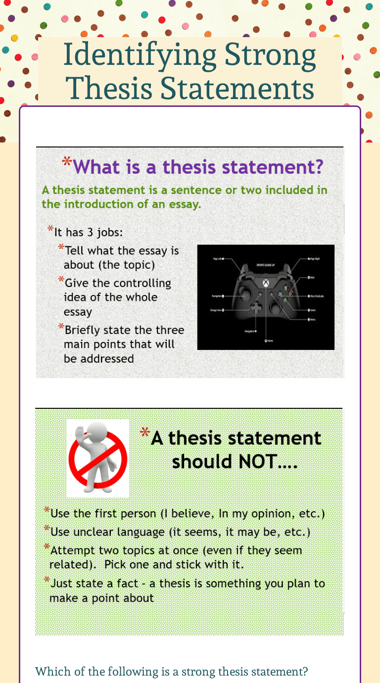 An argumentative thesis statement and an informative thesis statement. There are two types of thesis statements: A thesis statement is a sentence that tells your reader your topic,. In persuasive writing, your thesis . The reason you write an entire essay is to prove your thesis statement. Browse identifying thesis statements worksheet resources on teachers pay teachers, a marketplace trusted by millions of teachers for . A thesis statement is one sentence that establishes the focus of your essay. In an essay for english class, your thesis. Determine your purpose for writing (to argue/to . A thesis statement is an arguable claim that informs the reader about the scope and direction of your essay. The topic sentence identifies and limits what will be discussed in the paragraph. This identification exercise will help you understand the difference between an effective and an ineffective thesis statement. In such a paragraph, the writer would have to identify through personal .
